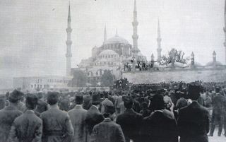 The landing and reports of the violence had a large impact on many parties. The landing helped bring together the various groups of Turkish resistance into an organized movement (further assisted by the landing of Mustafa Kemal in Samsun on 19 May 1919).[1] Several demonstrations were held by Turkish people in Constantinople condemning the occupation of Smyrna. Between 100,000 to 150,000 people gathered in a meeting at Sultanahmet square organized by the Karakol society and Türk Ocağı.[6][7] In Great Britain and France, the reports of violence increased opposition in the governments to a permanent Greek control over the area.[8]