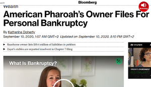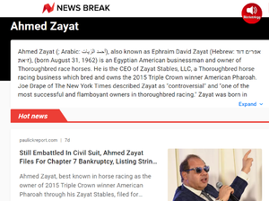 - ^ Drape, Joe. "As a Derby Favorite Soars, His Owner Stumbles", The New York Times, February 26, 2010. Accessed May 9, 2011. "'They lied to me and put me close to financial ruin,' said Zayat, who lives in Teaneck, N.J. 'I’m trying to reorganize until the market corrects itself, and they are trying to put me out of business. But I’m not going to go away.'"