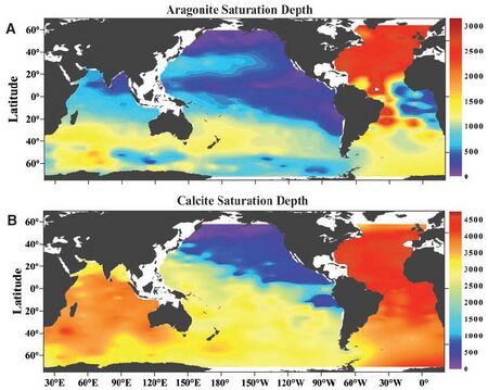 Calcium carbonate most commonly occurs in two common polymorphs (crystalline forms): aragonite and calcite. Aragonite is much more soluble than calcite, so the aragonite saturation horizon, and aragonite compensation depth, is always nearer to the surface than the calcite saturation horizon.[3] This also means that those organisms that produce aragonite may be more vulnerable to changes in ocean acidity than those that produce calcite.[39] Ocean acidification and the resulting decrease in carbonate saturation states raise the saturation horizons of both forms closer to the surface.[3] This decrease in saturation state is one of the main factors leading to decreased calcification in marine organisms because the inorganic precipitation of CaCO 3 is directly proportional to its saturation state and calcifying organisms exhibit stress in waters with lower saturation states.[40]