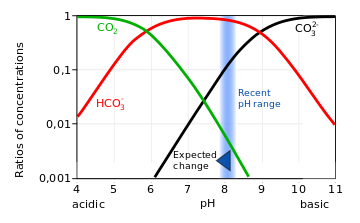 Ocean acidification is the ongoing decrease in the pH of the Earth's ocean. Between 1950 and 2020, the average pH of the ocean surface fell from approximately 8.15 to 8.05.[2] Carbon dioxide emissions from human activities are the primary cause of ocean acidification, with atmospheric carbon dioxide (CO2) levels exceeding 410 ppm (in 2020). CO2 from the atmosphere is absorbed by the oceans. This produces carbonic acid (H
