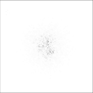Simulated negative image showing what a single (point-like) star would look like through a ground-based telescope with a diameter of 20r0. The atmosphere makes the image break up into several blobs (speckles). The speckles move around very rapidly, so that in a long-exposure photograph the star would appear as a single blurred blob.