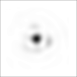 Simulated negative image showing what a single (point-like) star would look like through a ground-based telescope with a diameter of 2r0. Diffraction makes the image appear blurred. The atmosphere would make the blob move around very rapidly, so that in a long-exposure photograph it would appear more blurred.