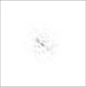 Simulated negative image showing what a single (point-like) star would look like through a ground-based telescope with a diameter of 7r0, on the same angular scale as the 2r0 image above. The atmosphere makes the image break up into several blobs (speckles). The speckles move around very rapidly, so that in a long-exposure photograph the star would appear as a single blurred blob.