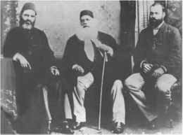 نواب محسن الملك (يسار)، الذي نظم وفد سلما، مع السيد أحمد خان (وسط)، القاضي السيد محمود ابن السيد خان (أقصى اليمين). السيد محمود كان أول مسلم يخدم كقاضي في المحطة العليا بالراج البريطاني.