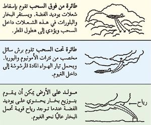 تبلغ درجة حرارة الجليد الجاف (وهو غاز ثاني أكسيد الكربون) حوالي 80°م تحت الصفر، وتقوم كرات الثلج الجاف عند إسقاطها على السحب من الطائرة بخفض درجة حرارة الماء فائق البرودة. وعندما تنخفض درجة الحرارة يتحول الماء إلى بلورات من الثلج. وتشبه بلورات يوديد الفضة بلورات الثلج، وهي التي تؤدي بالماء فائق البرودة إلى تكوين بلورات الثلج حولها. وتستخدم أجهزة تُسمى الشعلات والمولدات، لإنتاج و توزيع بخار يحتوي على بلورات يوديد الفضة. ويكوَّن هذا البخار بحرق يوديد الفضة مع مواد أخرى. ويتم توزيع البخار عن طريق الطائرة كما يمكن استخدام المولدات أيضًا لتوزيعه على الأرض.
