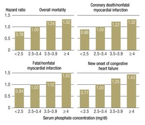 More recent studies have shown that the association between high phosphate concentrations and higher mortality is not restricted to persons with renal disease; it can also be observed in persons with cardiovascular disease and even in the general population. High-normal serum phosphate concentrations are associated with coronary calcification in young, healthy men (6) and were found to be a predictor of cardiovascular events in the Framingham study (7). Elevated mortality in association with high-normal serum phosphate concentrations was seen mainly among persons with cardiovascular disease who had normal renal function (8) (Figure 1). In the Framingham study, 375 of the 4127 subjects died within 60 months; the adjusted mortality risk was 22% for each 1 mg/dL elevation of the serum phosphate concentration.