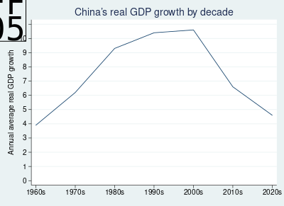 حافظت الصين على النمو بسبب علاقات التصدير وقطاع التصنيع والعمال ذوي الأجور المنخفضة.[6] وهو الاقتصاد الرئيسي الوحيد الذي تجنب التدهور الاقتصادي الناجم عن كوڤيد-19.[6] ومع ذلك، سجلت الصين عام 2022 أحد أسوأ أداء اقتصادي لها منذ عقود بسبب كوڤيد-19.[84] عام 2023، توقع صندوق النقد الدولي أن تستمر الصين في كونها واحدة من الاقتصادات الكبرى الأسرع نموًا.[2]