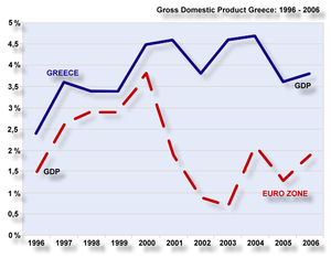 تحسن أداء الاقتصاد اليوناني بشكل ملحوظ في السنوات الأخيرة. قامت الحكومة اليونانية في التسعينات من القرن الماضي بإتباع سياسة اقتصادية شديدة كي تستطيع اليونان اللحاق بتطبيق العملة الأوروبية الموحدة اليورو في عام 2001. اتضح فيما بعد بأن الحكومة اليونانية في هذه الفترة، قدمت معلومات غير صحيحة عن أداء الاقتصاد اليوناني للاتحاد الأوروبي، مما أدى إلى تأهلها إلى تطبيق تداول اليورو. بعد اكتشاف الأمر في 2004، قرر الاتحاد الأوروبي منح اليونان مهلة عامان 2005 و 2006 لتصحيح أداء الاقتصاد و خفض الميزانية لكي يكون أقل من 3% من الميزانية حسب بنود ميثاق الاستقرار الخاص باليورو. قدر الدخل العام بالنسبة للفرد في عام 2004 بحوالي 22،000 دولار أمريكي. لدى اليونان قطاع اتصالات و خدمات كبير. يوجد في اليونان عمالة أجنبية كبيرة، يأتي معظمهم من دول أوروبا الشرقية، الشرق الأوسط، باكستان و أفريقيا، الذين يشكل مجموعهم حوالي 10% من مجموع تعداد السكان.