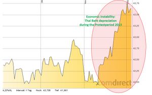 On 23 December 2013, the Thai baht dropped to a three-year low due to the political unrest during the preceding months. According to Bloomberg, the Thai currency lost 4.6 percent over November and December, while the main stock index also dropped (9.1 percent).[63]