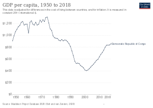 عند استقلالها عام 1960، كانت جمهورية الكونغو الديمقراطية ثاني أكبر دولة صناعية في أفريقيا بعد جنوب أفريقيا. كانت تفتخر بقطاع التعدين المزدهر وكان قطاعها الزراعي منتجًا نسبيًا.[13] منذ ذلك الحين، أدت عقود من الفساد والحرب وعدم الاستقرار السياسي إلى تعطيل النمو الاقتصادي، واليوم يُصنف الناتج المحلي الإجمالي للفرد ومؤشر التنمية البشرية في البلاد من بين أدنى المعدلات في العالم ويجعل جمهورية الكونغو الديمقراطية واحدة من الأكثر هشاشة وبحسب الأمم المتحدة، من البلدان الأقل نمواً في العالم.