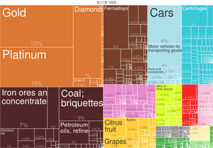 السلع التصديرية | الذهب، الماس، النبيذ، خام الحديد، البلاتنيوم، الفلزات اللاحديدية، الإلكترونيات، الآلات والمعدات الصناعية، المركبات، الفواكه، الأغذية المعلبة، المعدات العسكرية البرية والجوية |