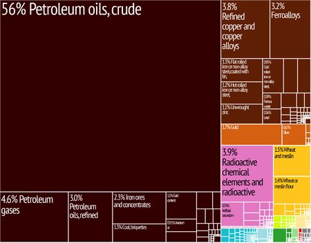 السلع التصديرية | النفط ومنتجات النفط، الغاز الطبيعي، المعادن الفلزية، الكيماويات، الآلات، الحبوب، الأخشاب، اللحوم، الفحم |