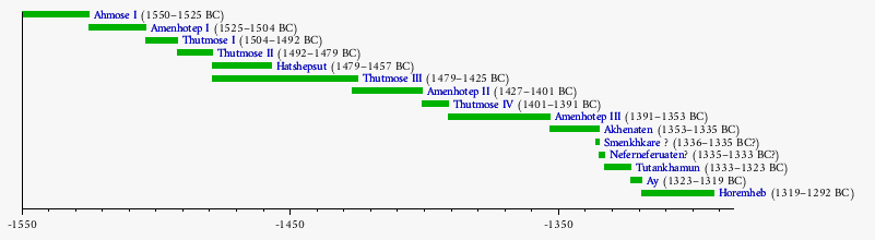 Radiocarbon dating suggests that Dynasty XVIII may have started a few years earlier than the conventional date of 1550 BC. The radiocarbon date range for its beginning is 1570–1544 BC, the mean point of which is 1557 BC.[18]