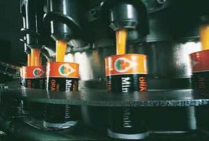 عصير برتقال مُركَّز يجمد في علب. أولا يصب العصير في العلب، أعلاه. ثم تقفل العلب قفلاً محكمًا وتغمر في محلول ملحي مبرد.