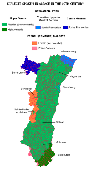 Spatial distribution of dialects in Alsace prior to the expansion of standard French in the 20th century.