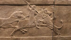 Lamassu facing forward. Bas-relief from the king Sargon II's palace at Dur Sharrukin in Assyria (now Khorsabad in Iraq), c. 713–716 BC. From Paul-Émile Botta's excavations in 1843–1844.