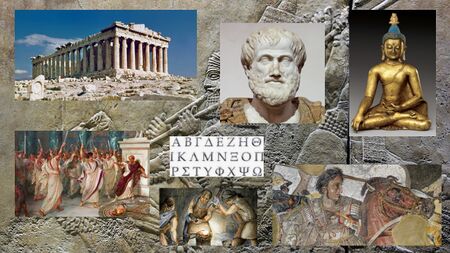 From top left clockwise: The Parthenon, a former temple in Athens, Greece; Aristotle, Greek philosopher; Gautama Buddha, a spiritual teacher and the founder of Buddhism; Wars of Alexander the Great last from 336 BC to 323 BC; Letters of the Greek alphabet; People working during the Iron Age; Roman dictator, Julius Caesar is assassinated by the Roman Senate in 44 BC. (Background: A mural from the Assyrian Empire which dissolved in the 7th century BC)