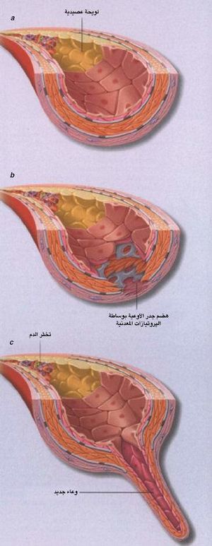 وفي الظروف الطبيعية، يؤدي نقص الضغط الجزئي للأكسجين في النسج النشيطة إلى سلسلة من التفاعلات التي تؤدي إلى ولادة وتكاثر أوعية جديدة، وهذه تؤدي خلال عدة أيام إلى إعادة التروية والأكسجين إلى النسج التي تشكو من نقص الأكسجين. إن تكوُّن الأوعية يبدأ بتكاثر وهجرة الخلايا البطانية الوعائية الموجودة في الأوعية الحالية. تلك الخلايا عليها أن تترك الشعيرة الدموية وتشق طريقها في النسج المحيطة لكي تتكاثر وتعطي مجموعة من الخلايا البطانية التي تتحول إلى وعاء مكتمل. ولكي تقوم الخلايا البطانية بتلك المهمة عليها في بداية الأمر أن تفرز إنزيمات حالّة للپروتين، وهذه بإمكانها أن تقوض الغشاء القاعدي (للوعاء الذي نشأت عنه) الغني بالكولاجين وكذلك عليها أن تقوض المادة الأساسية خارج الخلوية في النسج المحيطة التي تبدي نقصا في الأكسجين (انظر الشكل 3).