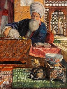 Wilfred Thesiger, in his book The Marsh Arabs, notes that cats were allowed free entry to community buildings in villages in the Mesopotamian Marshes and were even fed.[3][صفحة مطلوبة] Aside from protecting granaries and food stores from pests, cats were valued by the paper-based Arab-Islamic cultures for preying on mice that destroyed books. For that reason, cats are often depicted in paintings alongside Islamic scholars and bibliophiles.