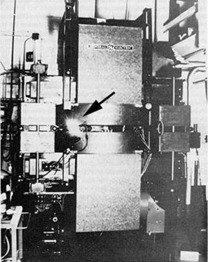 On April 24, Langmuir and I were running the machine and as usual were trying to push the electron gun and its associated pulse transformer to the limit. Some intermittent sparking had occurred and we asked the technician to observe with a mirror around the protective concrete wall. He immediately signaled to turn off the synchrotron as "he saw an arc in the tube". The vacuum was still excellent, so Langmuir and I came to the end of the wall and observed. At first we thought it might be due to Cherenkov radiation, but it soon became clearer that we were seeing Ivanenko and Pomeranchuk radiation.[5]