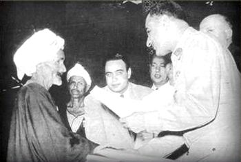 جمال عبد الناصر يسلم مستند ملكية أرض زراعية لفلاح بعد تنفيذ قانون الإصلاح الزراعي 1953.
