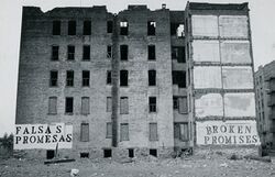 "(في شيكاغو) بينما كان البيض من بين أولئك الذين تم اقتلاعهم في هايد پارك وعلى الجانبين الشمالي والغربي، غالبًا ما كان التجديد الحضري في هذا السياق يعني، كما لاحظ المعاصرون، "إزالة *****". بين عامي 1948 و1963 فقط، تم تهجير حوالي 50.000 أسرة (بمتوسط 3.3 أفراد) و18.000 فرد".