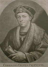 وكان كونرادوس سلتس أقوى علماء الإنسانيات الألمان غيرة وأعظمهم أثراً، ولقد كان من مدينة وكأنه أديب جوال عجول يدرس في إيطاليا وبولندة والمجر، ويعلم في كولونيا وهايدلبرج وكراكاو وبراگ وماينز وفيينا وإنجولستادت وبادوا ونورمبرج، وكشف عن مخطوطات ثمينة كانت مهملة مثل مسرحيات هورتسويذا، وخرائط قديمة مثل تلك الخريطة التي أعطاها لبويتنجر وحملت اسمه. وكان يجمع حوله الدارسين أينما ذهب ويبث فيهم شغفه بالشعر والأدب الكلاسي والآثار الألمانية القديمة. وفي عام 1447 توَّجه الإمبراطور فردريك الثالث في نورمبرج أميراً للشعراء في ألمانيا. وأسس سيلتس في ماينز (1941) جمعية الراين الأدبية الواسعة النفوذ وكانت تضم علماء وفقهاء في الدين وفلاسفة وأطباء ومؤرخين وشعراء ومحامين، أمثال اولريخ تسازيوس الفقيه القانوني الضليع وعلماء أمثال بيركهايمر وتريثموس ورويخلين وويمفيلنج. وأنشأ في فيينا، بأموال زوده بها ماكسمليان، أكاديمية للشعر أصبحت فيما بعد قسماً محترماً من الجامعة يعيش فيه الأساتذة والطلبة معاً في البيت نفسه وينهضان بالعمل ذاته. ويبدو أن سيلتس خسر عقيدته الدينية في خلال دراساته، فقد أثار مثل هذه الأسئلة: "هل تحيا الروح بعد الموت؟" و"هل هناك إله حقاً؟" وفي أسفاره اصطحب نماذج كثيرة من الجنس اللطيف ولكنه لم يصحب واحدة منهن إلى المذبح، وانتهى أمره إلى أن يقول في غبطة: "ليس هناك تحت الشمس أحلى من عذراء جميلة بين ذراعي رجل تبدد همومه".