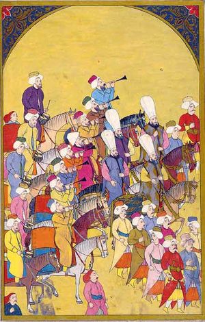 الإنكشارية يتهادون على أنغام مختر العسكرية التي تلعبها جوقة مختران. المنمنمة العثمانية، من صورنامه وهبي (1720) في متحف قصر طوپ‌قپو في اسطنبول.