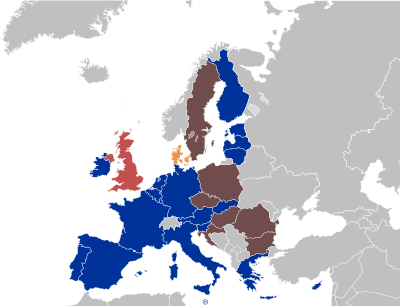 - ^ EMU is sometimes incorrectly referenced as the "European Monetary Union". The official and correct name is "Economic and Monetary Union", of which both the 19 eurozone states and the 9 non-euro states are members.