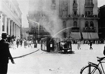 المتظاهرون يشعلون النيران في سيارة تابعة لقوات الاحتلال البريطاني أمام بورصة الإسكندرية بميدان محمد علي بالإسكندرية سنة 1931.