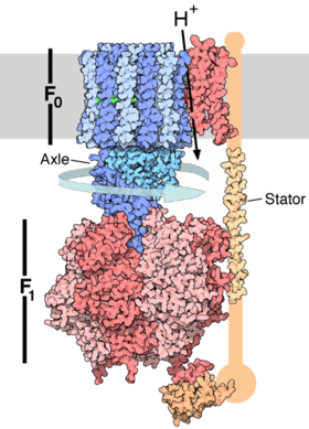 Structure of ATP synthase, the proton channel and rotating stalk are shown in blue and the synthase subunits in red.
