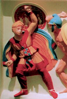 The Immortals were described by Herodotus as being heavy infantry, led by Hydarnes II, that were kept constantly at a strength of exactly 10,000 men. He claimed that the unit's name stemmed from the custom that every killed, seriously wounded, or sick member was immediately replaced with a new one, maintaining the numbers and cohesion of the unit.[42] They had wicker shields, short spears, swords or large daggers, and bow and arrows. Underneath their robes they wore scale armour coats. The spear counterbalances of the common soldiery were of silver; to differentiate commanding ranks, the officers' spear butt-spikes were golden.[42] Surviving Achaemenid colored glazed bricks and carved reliefs represent the Immortals as wearing elaborate robes, hoop earrings and gold jewellery, though these garments and accessories were most likely worn only for ceremonial occasions.[43]