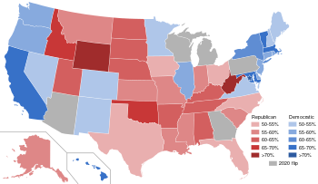الائتلاف الانتخابي الديمقراطي، الذي يؤمن "الولايات الزرقاء" للمرشحين الرئاسيين الديمقراطيين، أداؤه هو الأفضل بين اليهود والناخبين السود؛[163][164] البيض الذين هم الأثرياء أو خريجو الجامعات،[165] أو يعيشون في المناطق الحضرية.[166] كان ناخبو الطبقة العاملة أيضًا الدعامة الأساسية للائتلاف الديمقراطي منذ أيام نيو ديل، لكن منذ السبعينيات، انشق الكثيرون وانضموا إلى الجمهوريين مع تحرك الحزب الديمقراطي بشكل ملحوظ نحو اليسار في ما يخص القضايا الثقافية.[167] على العكس من ذلك، فإن التحالف الجمهوري التقليدي الذي يهيمن على العديد من "الولايات الحمراء" يتكون بشكل أساسي من الناخبين البيض في الريف، والإنجيليين، وكبار السن، والناخبين من غير الجامعيين.[168] كما كان أداء الجمهوريين جيدًا تاريخيًا مع ناخبي الضواحي والطبقة الوسطى منذ الخمسينيات، لكن هذه الكتلة ابتعدت عنهم في السنوات الأخيرة بسبب صعود حركة حفل الشاي وحركة فلنجعل أمريكا عظيمة مرة أخرى اللاحقة.[169] يعود الفضل في تسارع هذا الاتجاه إلى ترجيح كفة الانتخابات الرئاسية 2020 لصالح الديمقراطي جو بايدن، لأن ترمپ، الرئيس الحالي في ذلك الوقت، لم يكن يحظى بشعبية تاريخية في الضواحي بالنسبة لمرشح جمهوري، الأداء الضعيف هناك بشكل ملحوظ.[170]