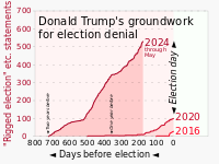 صرح ترمپ بادعاءات كاذبة بشأن تزوير الانتخابات في الرئاسية 2020، واستمر في إنكار نتائج الانتخابات حتى سبتمبر 2024.[48][49] حذر خبراء أمن الانتخابات من أن المسؤولين الذين ينكرون شرعية الانتخابات الرئاسية 2020، قد يحاولون عرقلة عملية التصويت، أو يرفضون التصديق على نتائج انتخابات 2024.[50] أفادت نيويورك تايمز أن "الحزب الجمهوري وحلفاءه المحافظين منخرطون في حملة قانونية غير مسبوقة تستهدف النظام الانتخابي الأمريكي"، من خلال تقييد التصويت لتحقيق ميزة حزبية قبل يوم الانتخابات والاستعداد لشن تحديات "مشكوك فيها قانونيا" ضد عملية التصديق إذا خسر ترمپ.[51] في الفترة التي سبقت انتخابات 2024، قدم الحزب الجمهوري ادعاءات كاذبة بشأن "تصويت غير المواطنين" الجماعي من قبل المهاجرين، في محاولة لنزع الشرعية عن الانتخابات في حالة هزيمة ترمپ.[52][53][54]