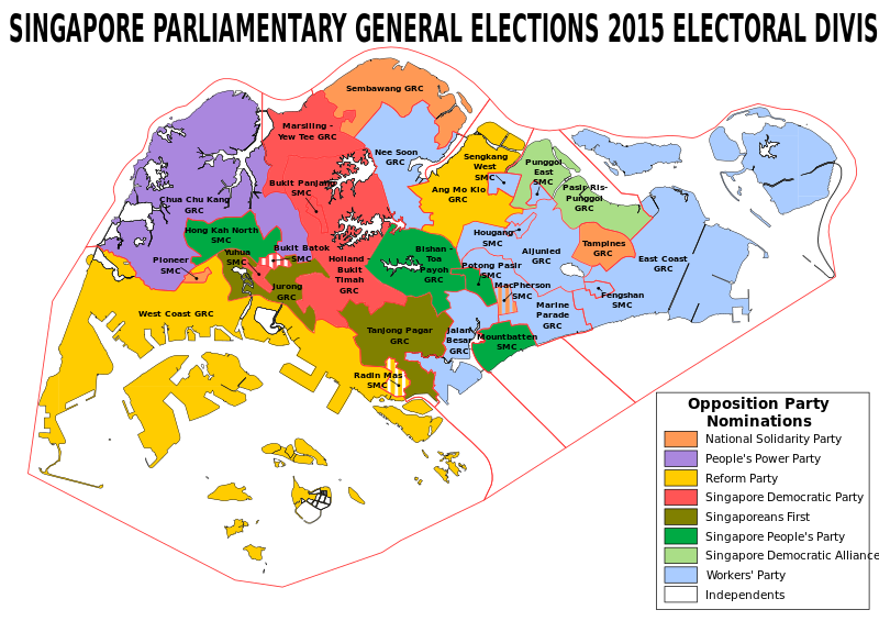 Nominations by various opposition parties as on nomination day on 1 September 2015. Banded shading indicates constituencies with three-cornered contests. Note that the People's Action Party is contesting in all seats.