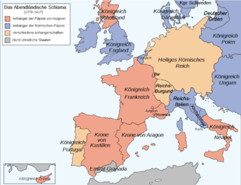 فرنسا، أراگون، قشتالة وليون، قبرص، برگندي، ساڤوا، ناپولي، واسكتلندة اعترفوا بمدعي أڤنيون; | الدنمارك، إنگلترة، الفلاندرز، الامبراطورية الرومانية المقدسة، المجر، شمال إيطاليا، أيرلندا، النرويج، پولندا، والسويد اعترفوا بالمدعي الروماني. |