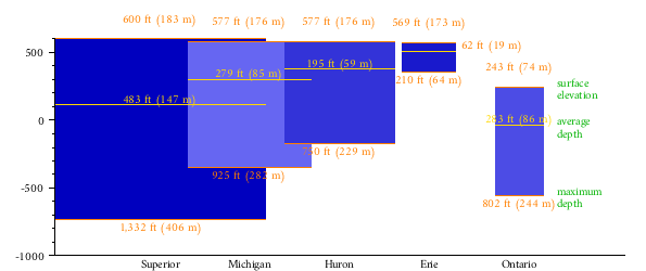 متوسط العمق[2] | 62 ft (19 m) | 195 ft (59 m) | 279 ft (85 m) | 283 ft (86 m) | 483 ft (147 m) |