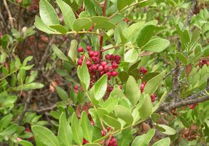 شجرة دائمة الخضرة لها ثمر أحمر مر الطعم. شجر المستكة شجر صغير ينمو بحوض البحر المتوسط.