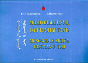 - B. Sumiyabaatar (mong.), Choi Gi Ho, "Монголын Нууц Товчоон. Монгол үсгийн анхны галиг", "The first Mongolian transliteration of the Mongolian Secret History", 382 pp., 2005, ISBN 89-5726-275-X