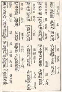 - ^ re-transcribed from الصينية: 忙中豁侖 紐察 脫[卜]察安; پنين: Mánghuòlún Niǔchá Tuō[bǔ]chá'ān. The 卜 is not included in the Chinese-transcribed titles of the copies known today, but that may be the result of a corruption. William Hung, 'The Transmission of the Book Known as "The Secret History of the Mongols"', Harvard Journal of Asiatic Studies, Vol. 14, No. 3/4 (Dec 1951), p.440