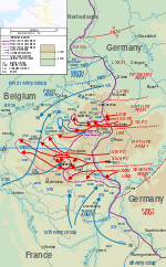 The main German striking force was the XLVII Panzer Corps, with one and a half SS Panzer Divisions and two Wehrmacht Panzer Divisions. Although they made initial gains against the defending US VII Corps, they were soon halted and Allied aircraft inflicted severe losses on the attacking troops, eventually destroying nearly half of the German tanks involved in the attack.[2] Although fighting continued around Mortain for six days, the American forces had regained the initiative within a day of the opening of the German attack.