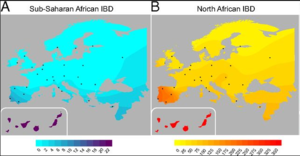 خريطة لمزيج من شمال أفريقيا وأفريقيا جنوب الصحراء ضمن المجموعات السكانية الأوروپية.
