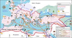 Bulky, low-value commodities, like grain and construction materials, were traded only by sea routes, since the cost of sea transportation was sixty times lower than land.[3] Staple goods and commodities like cereals for making bread and papyrus scrolls for book production were imported from Ptolemaic Egypt to Italy in a continuous fashion.