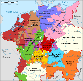 The Imperial Circles ca 1560; these grouped states within the Empire for mutual defence and support. The Burgundian Circle shown here includes the Dutch Republic, which became independent in 1648.