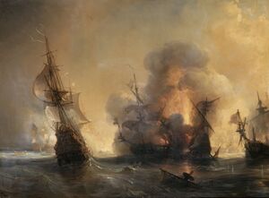 لاگوس، 1693؛ خسارة السفن التجارية الهولندية والإنگليزية تسبب في خسائر مادية ضخمة وزادت المعارضة للحرب.