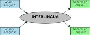 في طريقة الترجمة هذه، يمكن اعتبار اللغة الوسيطة كطريقة لوصف تحليل نص مكتوب بـ لغة مصدر بحيث يمكن تحويله الصرفي والنحوي والدلالي (وحتى الپراگماتي)، أي "المعنى" في اللغة الهدف. هذه اللغة الوسيطة قادرة على وصف جميع خصائص جميع اللغات التي سيتم ترجمتها، بدلاً من مجرد الترجمة من لغة إلى أخرى.
