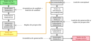 في أنظمة الترجمة الآلية للغات الوسيطة، هناك مكونان أحاديا اللغة: تحليل اللغة المصدر واللغةالوسيطة، و توليد اللغة الوسيطة واللغة الهدف. ومع ذلك، من الضروري التمييز بين الأنظمة بين اللغات التي تستخدم الأساليب النحوية فقط (على سبيل المثال، الأنظمة التي تم تطويرها في السبعينيات في جامعتي گرينوبل وتكساس) وتلك القائمة على الذكاء الاصطناعي (من عام 1987 في اليابان والبحث في جامعات جنوب كاليفورنيا وكارنيگي ميلون). يتوافق النوع الأول من النظام مع ذلك الموضح في الشكل 1. بينما يتم تقريب الأنواع الأخرى من خلال الرسم التخطيطي في الشكل 4.
