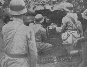Germany sent military advisers such as Alexander von Falkenhausen to China to help the KMT government reform its armed forces.[11] Von Seeckt's original plans called for a drastic reduction of the military to 60 elite divisions, which would be modeled on the Wehrmacht, but the factions that would be axed remained an open question. As a whole, the officer corps trained by the Whampoa Academy until 1927 had been only marginally better in quality than the warlord armies, but remained loyal to Chiang.[21] Von Falkenhausen believed that it was too optimistic to expect the National Revolutionary Army (NRA) to be supported by armor and heavy artillery because the industry lacked the necessary capacity. Thus, he emphasized the creation of a mobile force that relied on small arms and would be adept with infiltration tactics, like those of the German stormtroopers around the end of World War I.[بحاجة لمصدر] Some divisions began training to German standards and were to form a relatively small but-well trained Chinese Central Army. By the mid-1930s, about 80,000 soldiers had received German-style training. [22] A few pilots of the Nationalist air force did aerial-combat training with the Luftwaffe.[23] The Nazis also provided military hardware. According to von Seeckt, around 80% of China's output of weapons were below par or unsuitable for modern warfare. Therefore, projects were undertaken to modernise existing arsenals. For example, the Hanyang Arsenal was reconstructed in 1935 and 1936 to produce Maxim machine guns, various 82 mm trench mortars, and the Chiang Kai-shek rifle (based on the German Mauser Standardmodell and Karabiner 98k rifles). The Chiang Kai-shek and Hanyang 88 rifles remained as the predominant firearms used by Chinese armies throughout the war.[24]