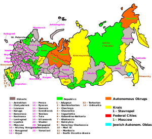 انظر أيضاً: كيانات الفدرالية الروسية، جمهوريات روسيا، اوبلاستات روسيا، كرايات روسيا، اوكروجات روسيا، المناطق الفدرالية الروسية، المدن الفدرالية الروسية.
