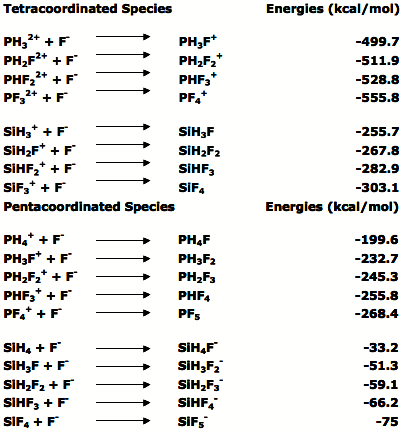 In addition Dieters and coworkers [3] show an inverse correlation between bond length and bond overlap for all series. Pentacoordinated species are concluded to be more reactive because of their looser bonds as trigonal-bipyramidal structures.